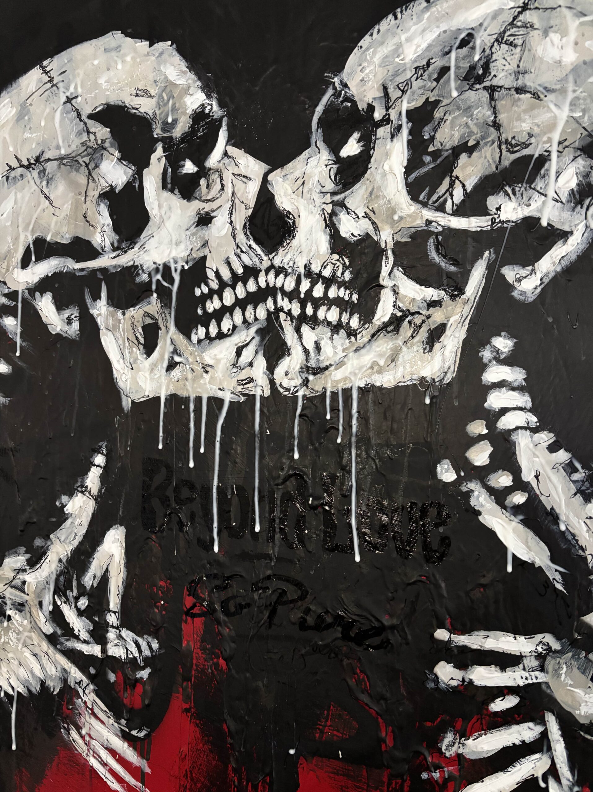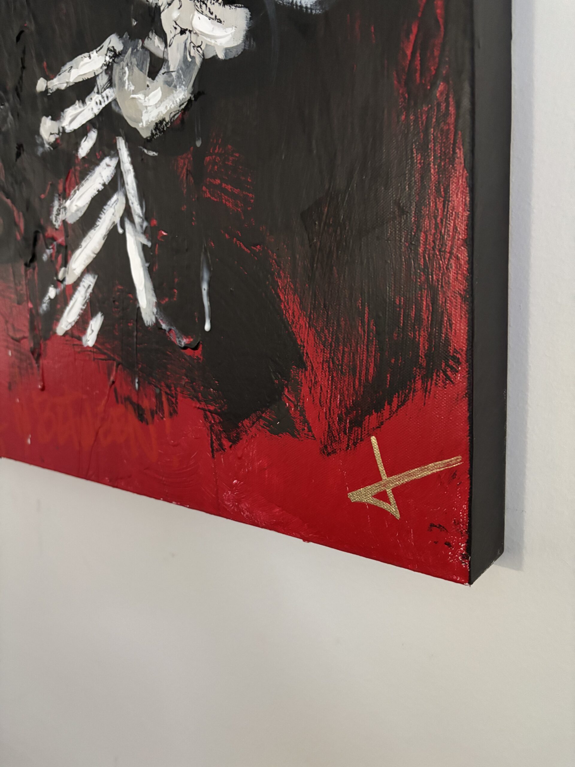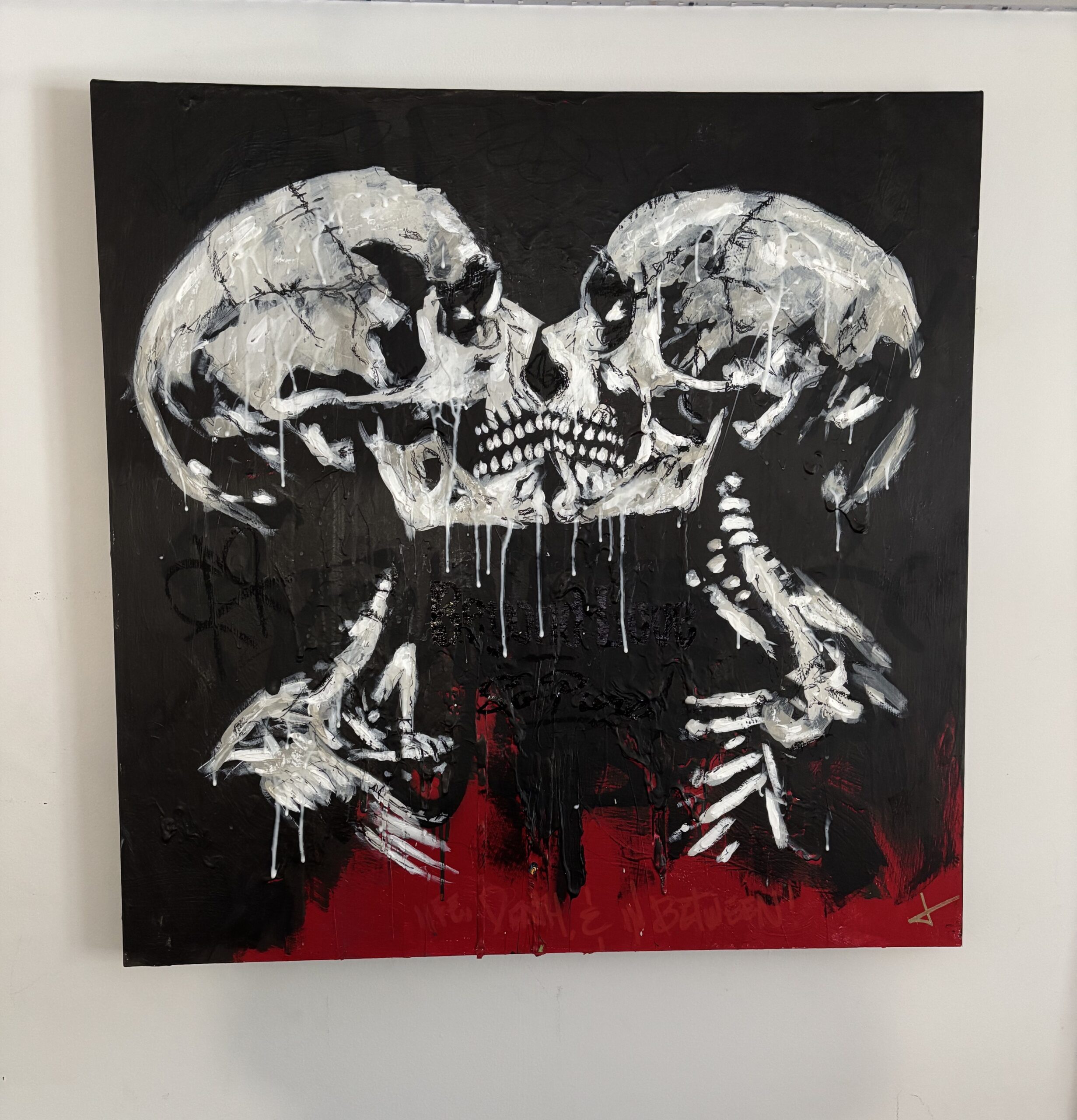Painted in stark black and white, the piece transforms mortality into communion. Each drip becomes a relic of emotion; each crack, a whisper of what remains after everything else has vanished. The skeletal forms no longer symbolize loss — they embody what endures when all masks, bodies, and pretenses are stripped away.